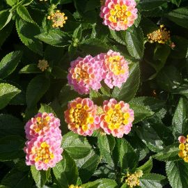 Lantana camara : une espèce vivace arbustive (jusqu'à 1,5 m), accomodante, très florifère tout l'été (et beaucoup plus longtemps sous climat très doux).
