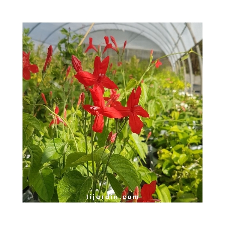 Sous-arbrisseau à floraison continue de l'été à l'automne. Fleurs en trompettes rouge vif contrastant sur son feuillage vert foncé. Culture en pleine terre sous climat doux, en pot partout ailleurs.